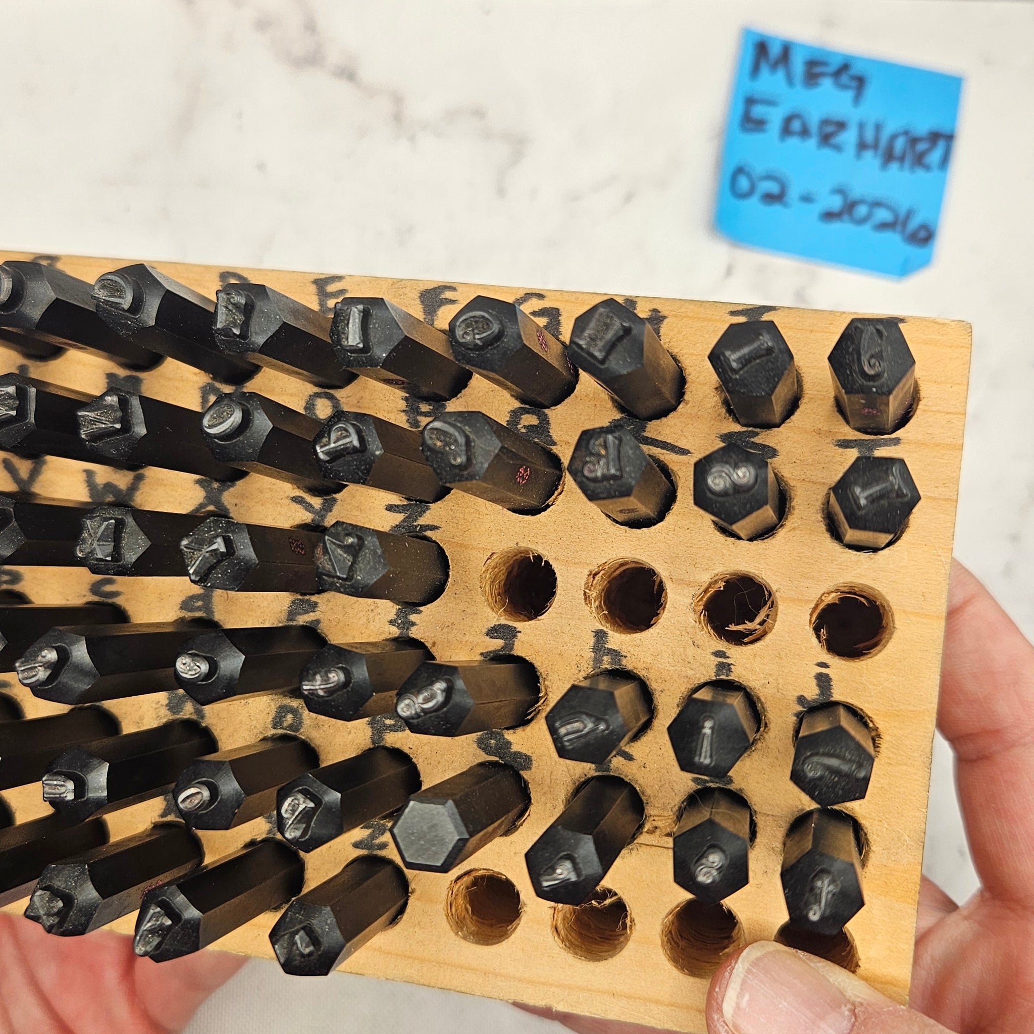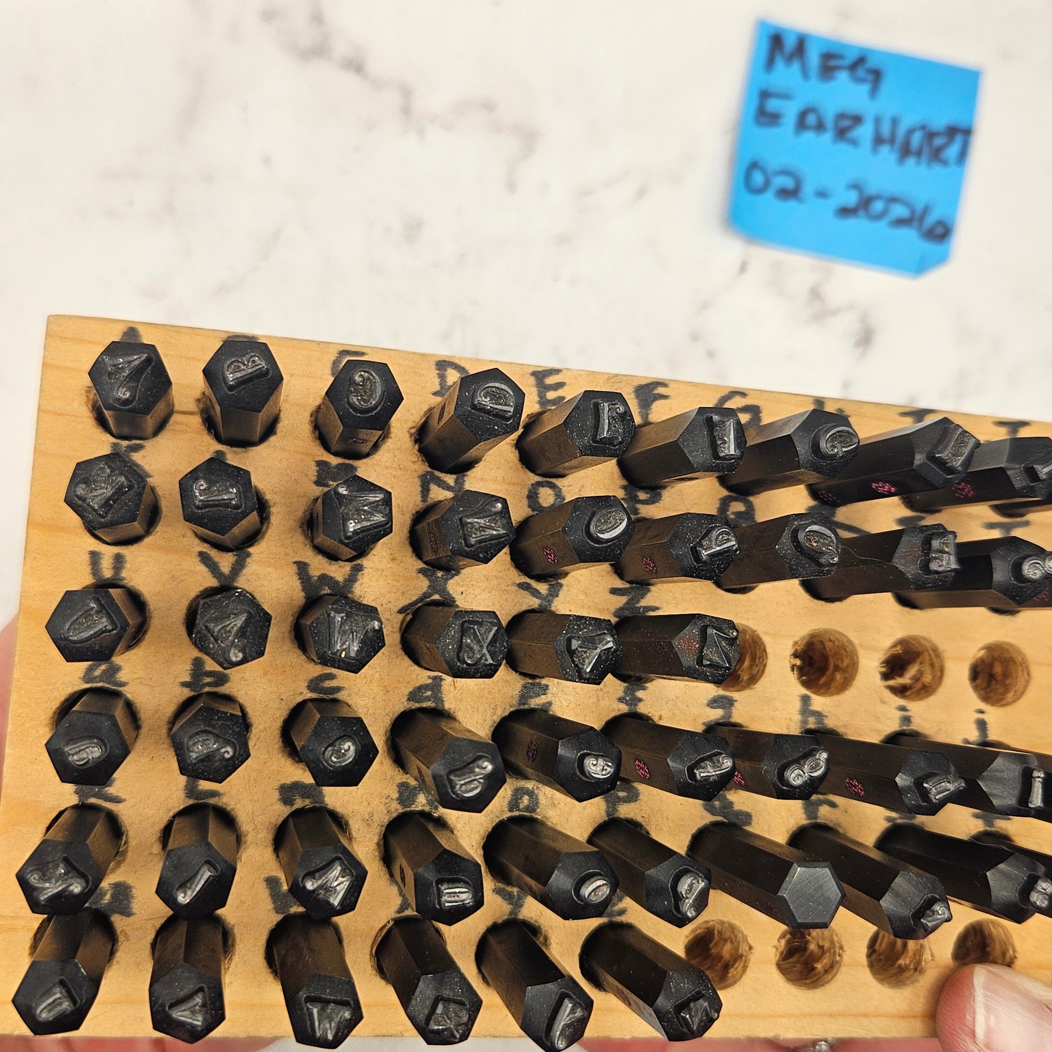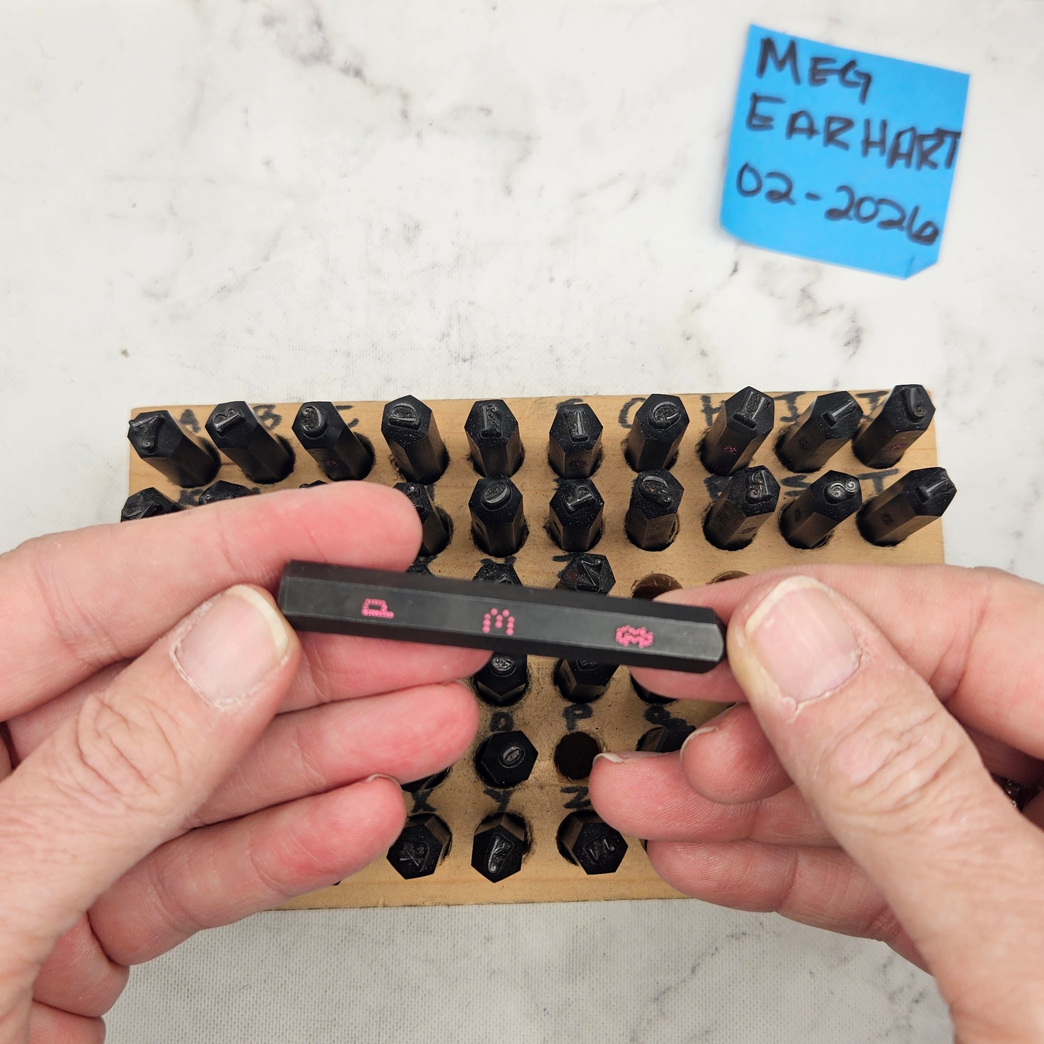I am retiring and destashing all of my stamping tools. All tools have been used on soft metals only (aluminum, copper, bronze). in excellent condition with no rust or chips. This set comes with the wood block pictured and both upper and lower case. I do not have the original boxes. This is Morando's V1 original black stamp with thicker lines than the current Tickled Pink. They actually work nicely together as you can see from the sample piece.